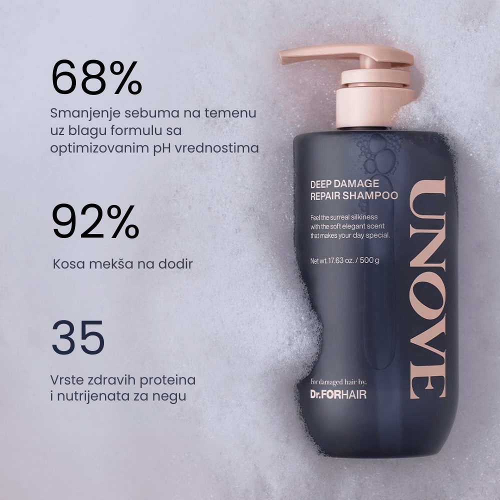 UNOVE Deep Damage Repair Shampoo obnavlja suvu i oštećenu kosu kombinacijom 30 proteina i aminokiselina, pružajući joj snagu, hidrataciju i sjaj.
