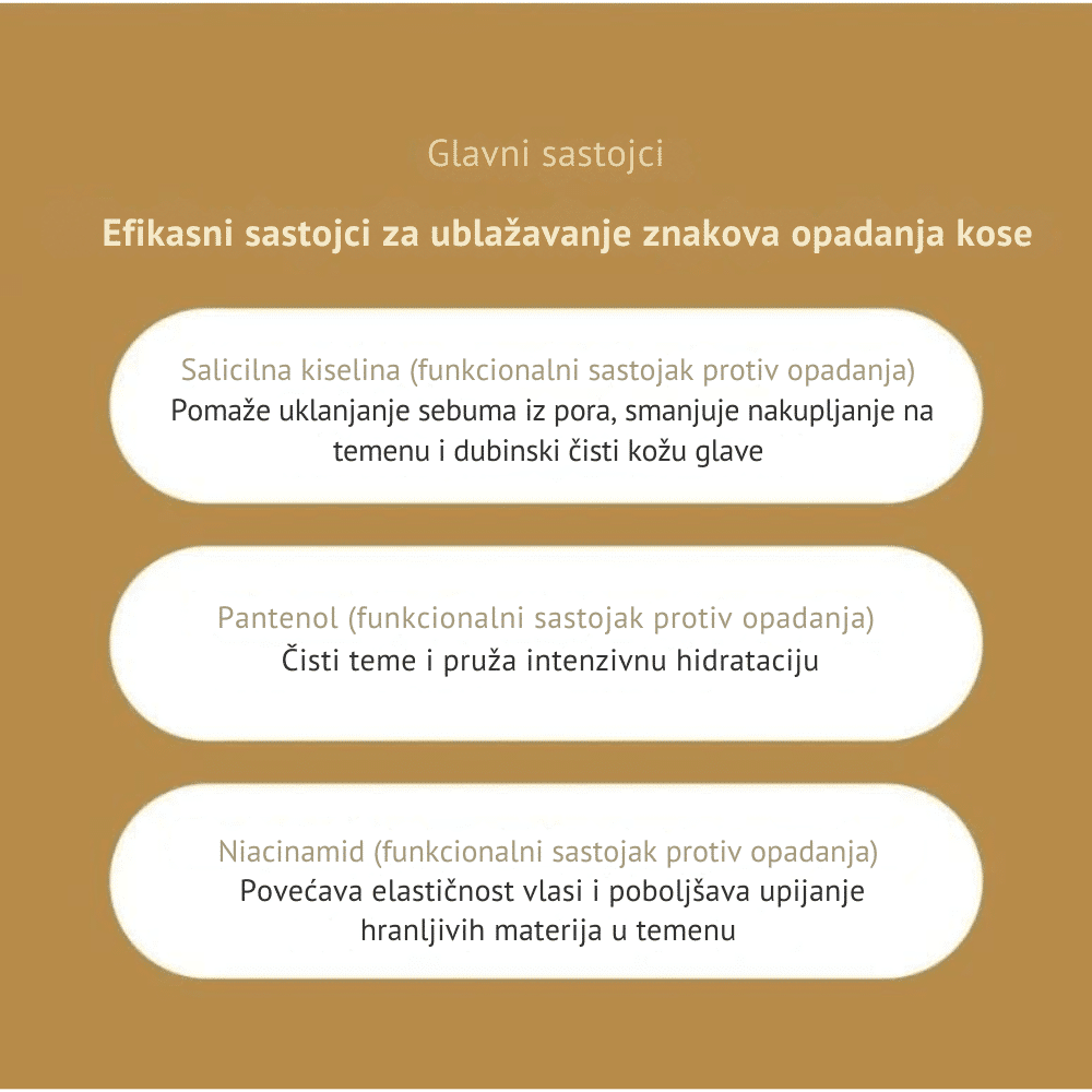 Blago kisela pH vrednost šampona pomaže u održavanju optimalnog balansa vlasišta, dok salicilna kiselina nežno uklanja mrtve ćelije i višak sebuma, sprečavajući začepljenje pora i omogućavajući bolju apsorpciju hranljivih sastojaka. Biljni ekstrakti poput Rehmannia glutinosa, Houttuynia cordata i ekstrakta đumbira dodatno stimulišu cirkulaciju i podstiču rast nove kose. Bez sulfata, silikona i parabena, ovaj šampon je pogodan za svakodnevnu upotrebu i osetljivo vlasište.