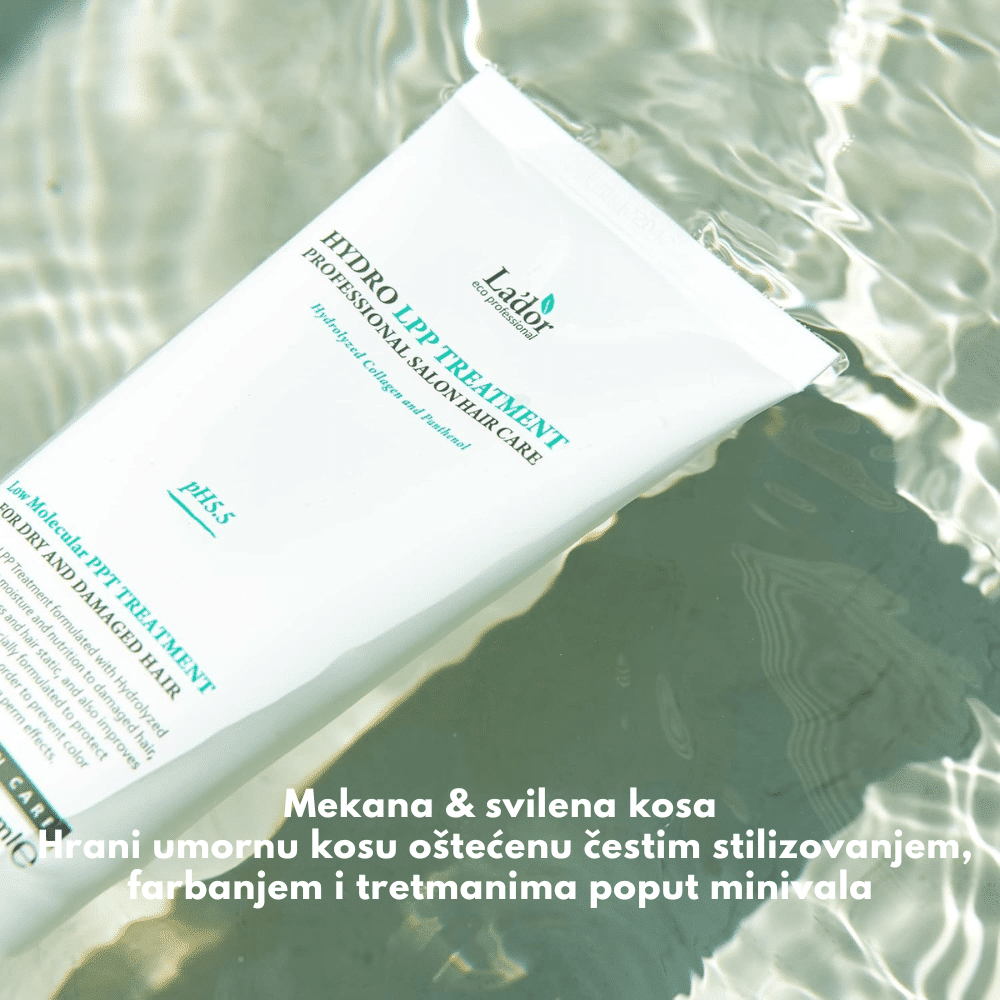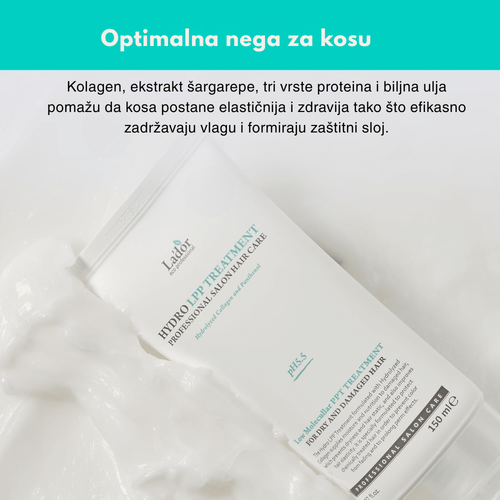 Lador Hydro LPP Treatment 530ml je profesionalni proteinski tretman za kosu, posebno formulisan za dubinsku obnovu suve, oštećene i hemijski tretirane kose. Njegova formula sa niskim pH vrednošću od 5.5 i niskomolekularnim proteinima (LPP) omogućava efikasnu penetraciju aktivnih sastojaka u vlas, pružajući intenzivnu hidrataciju, elastičnost i sjaj. Obogaćen hidrolizovanim kolagenom, pantenolom, maslinovim i jojobinim uljem, ovaj tretman jača strukturu kose, smanjuje lomljenje i čini kosu mekom i glatkom