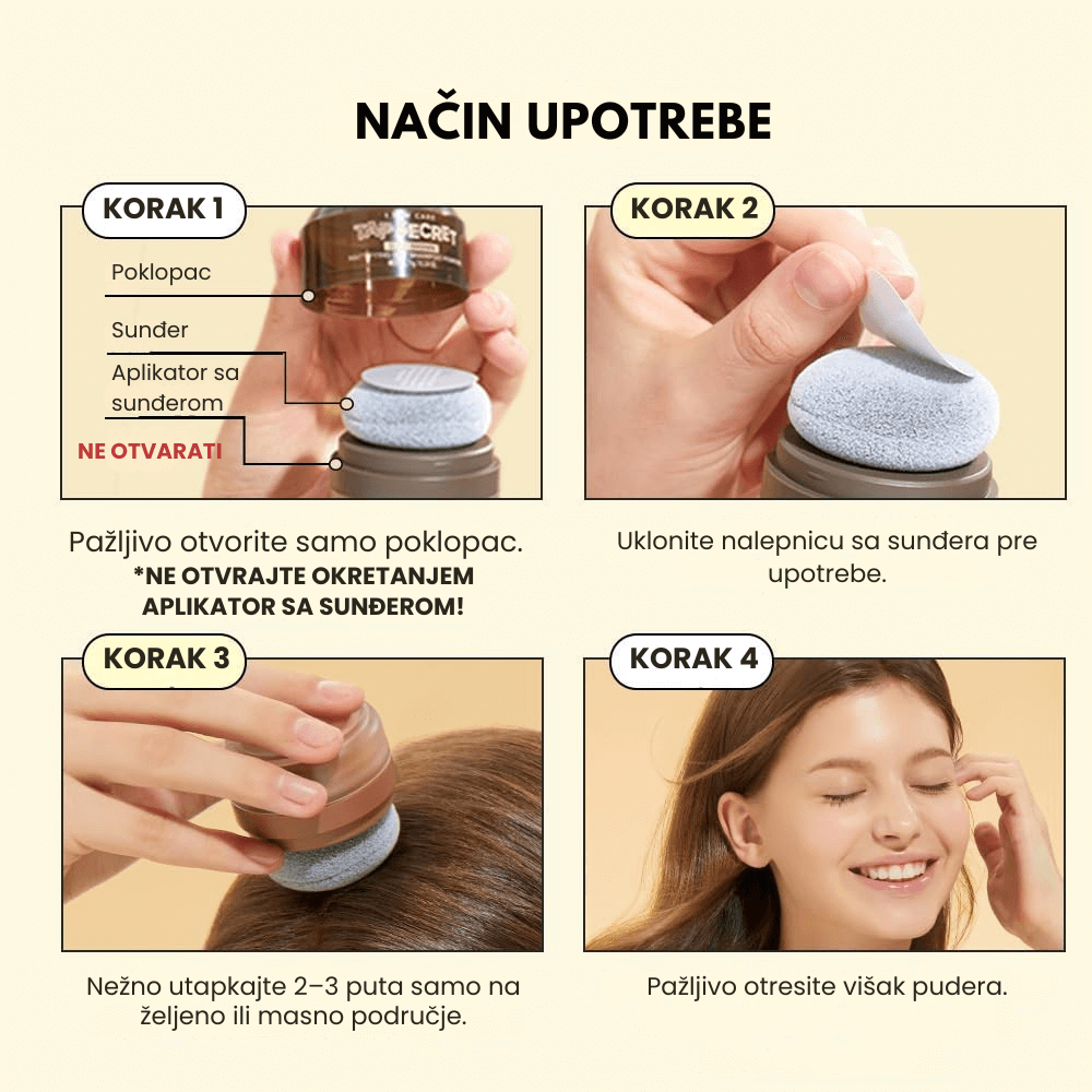 Držite aplikator uspravno i tapkajte ga na željeno područje kose 3-5 puta, fokusirajući se na koren. Nakon nanošenja, prstima ili četkom uklonite višak praha i oblikujte kosu po želji. Izbegavajte kontakt sa očima. U slučaju iritacije, prekinite upotrebu i konsultujte se sa stručnjakom.