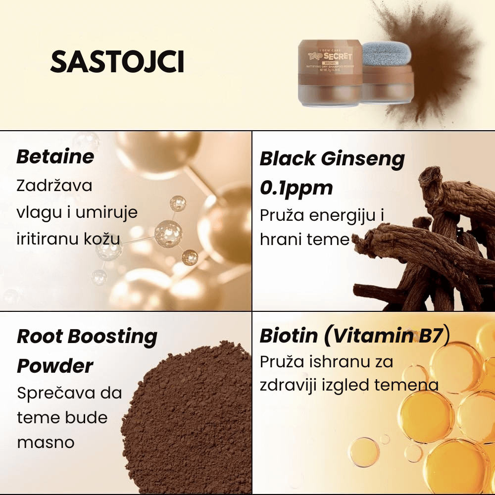 Suvi šampon u prahu za smeđu kosu koji upija višak masnoće, pruža mat završnicu, dodaje volumen i osvežava kosu između pranja.
