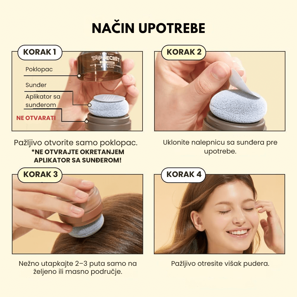 Držite aplikator uspravno i tapkajte ga na željeno područje kose 3-5 puta, fokusirajući se na koren. Nakon nanošenja, prstima ili četkom uklonite višak praha i oblikujte kosu po želji. Izbegavajte kontakt sa očima. U slučaju iritacije, prekinite upotrebu i konsultujte se sa stručnjakom.