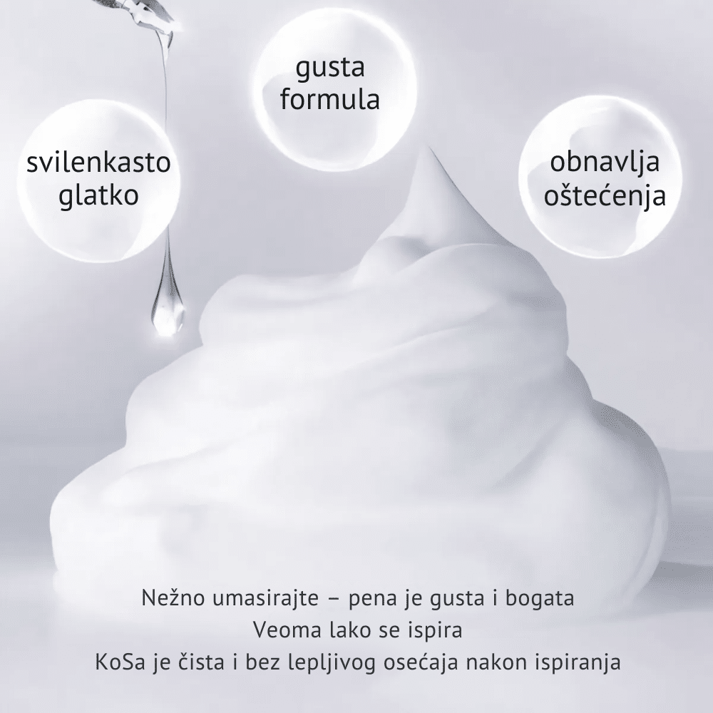 Intenzivna hidratacija i obnova za oštećenu kosu, sa zaštitom od UV zraka i vremenskih uticaja, ostavljajući kosu glatkom i sjajnom.
