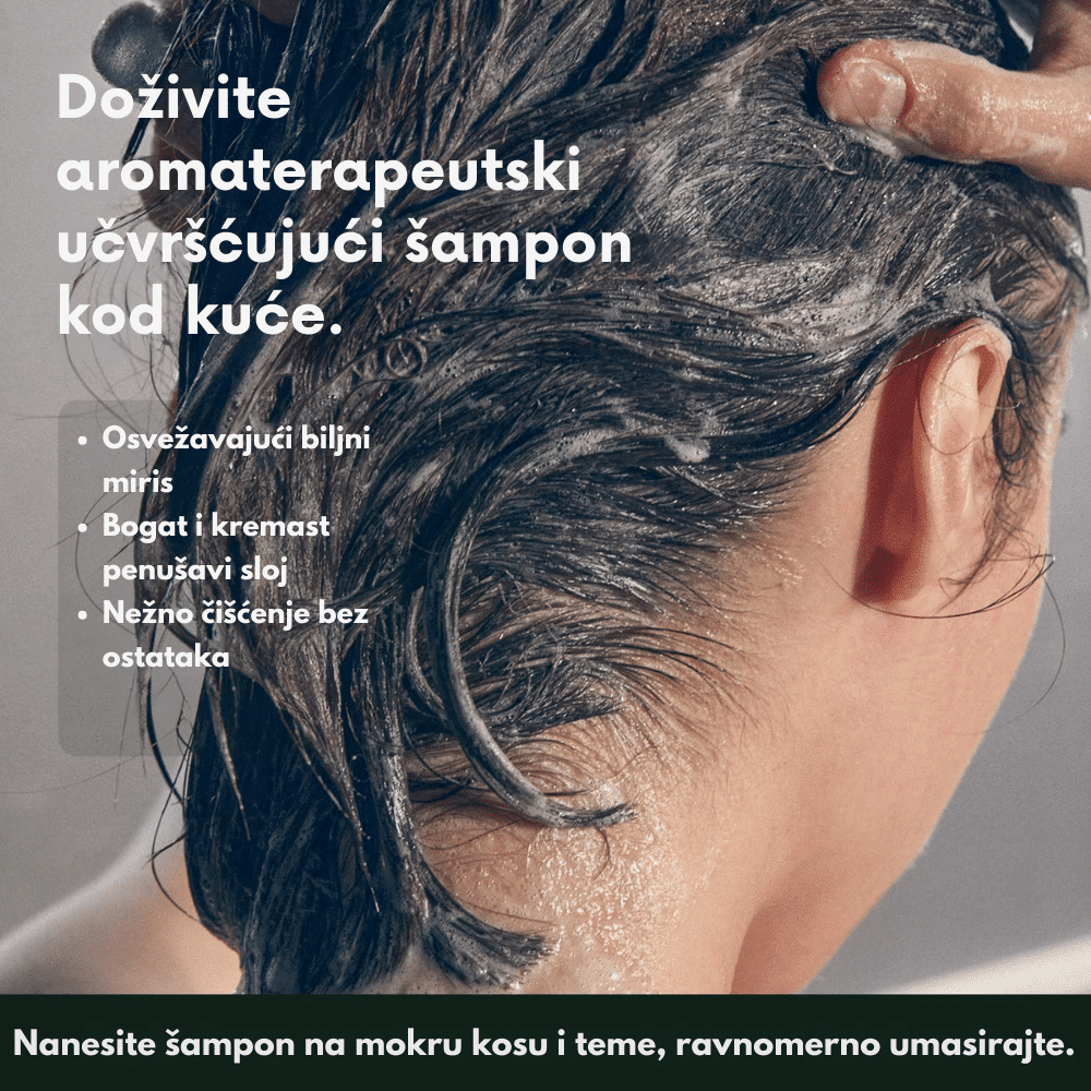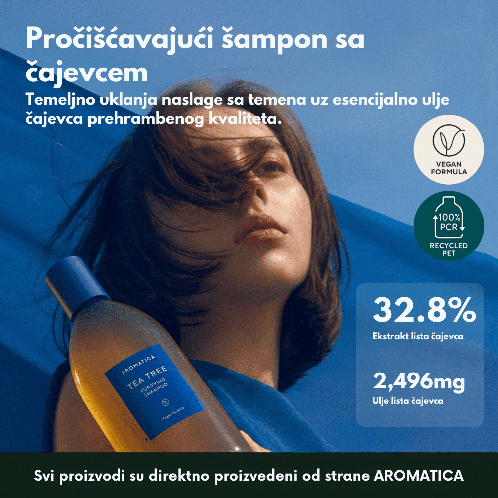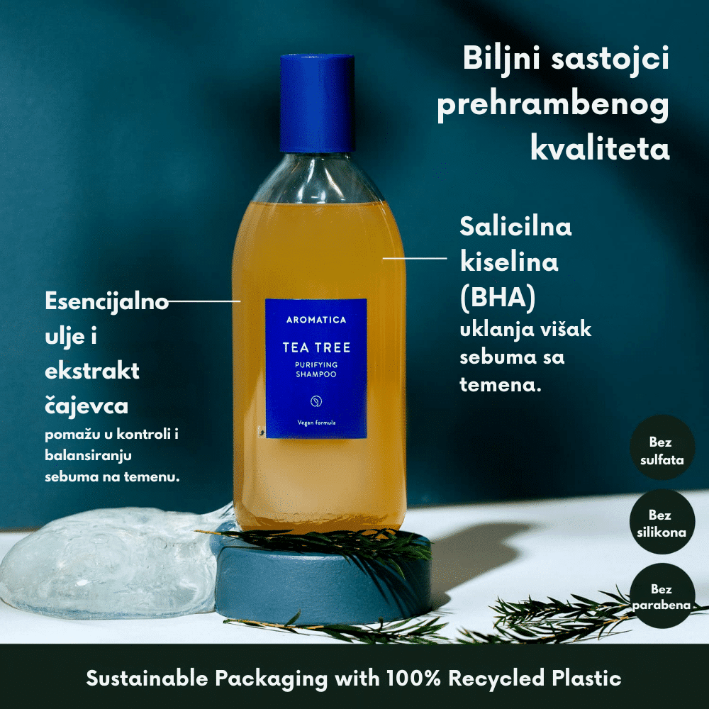 Osim što dubinski čisti, ovaj šampon pruža i osvežavajući osećaj zahvaljujući menti i pepermintu, koji hlade i umiruju vlasište, posebno nakon dužeg izlaganja suncu. Ekstrakti đumbira i drugih lekovitih biljaka dodatno revitalizuju vlasište, poboljšavajući njegovo ukupnu stanje.Redovnom upotrebom Aromatica Tea Tree Purifying Shampoo-a, vaša kosa će biti lagana, sveža i duže će zadržati čistoću. Ovaj šampon je idealan za one koji traže prirodno rešenje za masnu kosu i osetljivo vlasište, pružajući dugotrajnu svežinu i čistoću.