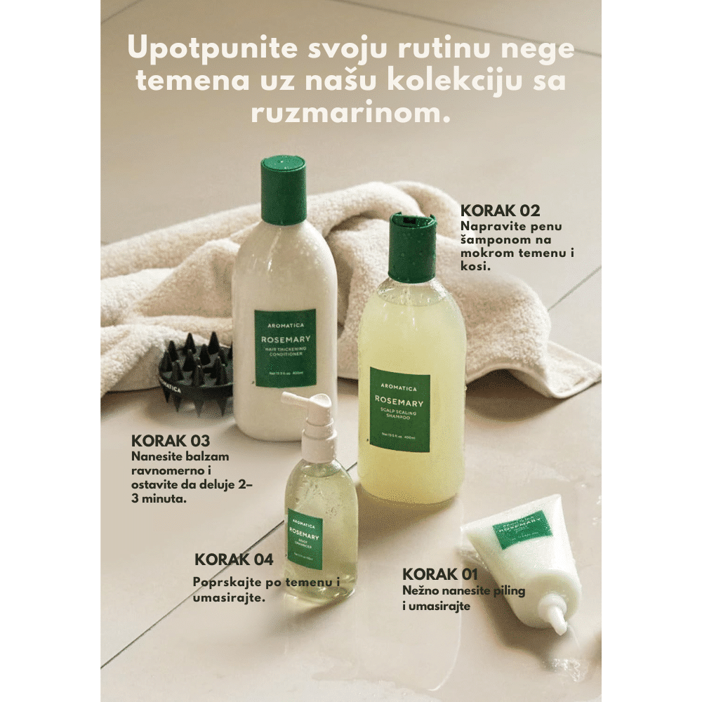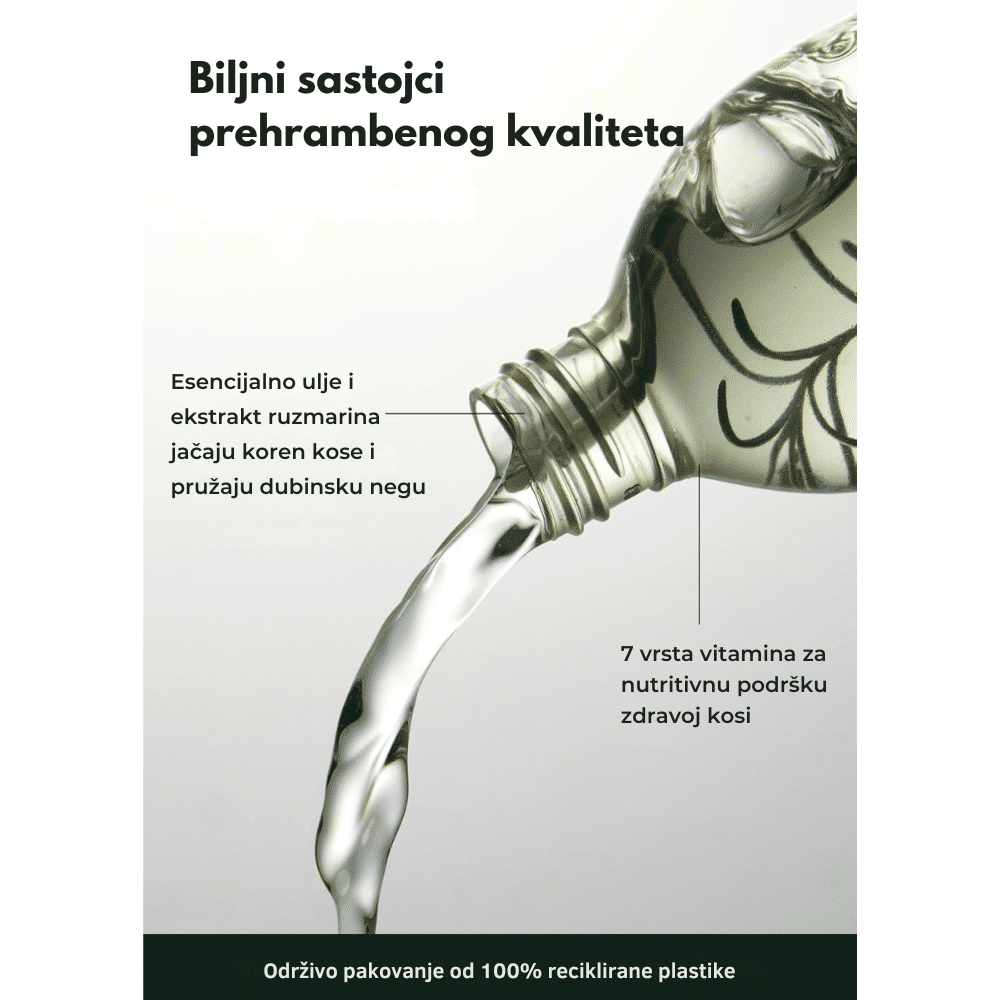 Ruzmarin poboljšava cirkulaciju vlasišta, jača folikule i podstiče rast kose, čineći je gušćom, otpornijom i manje sklonom opadanju. Njegova antimikrobna i seboregulirajuća svojstva pomažu u održavanju zdravog vlasišta, smanjujući masnoću, perut i iritacije bez isušivanja kose. Deluje kao prirodni revitalizator koji poboljšava elastičnost, vraća sjaj i čini kosu glatkom i snažnom od korena do vrhova.