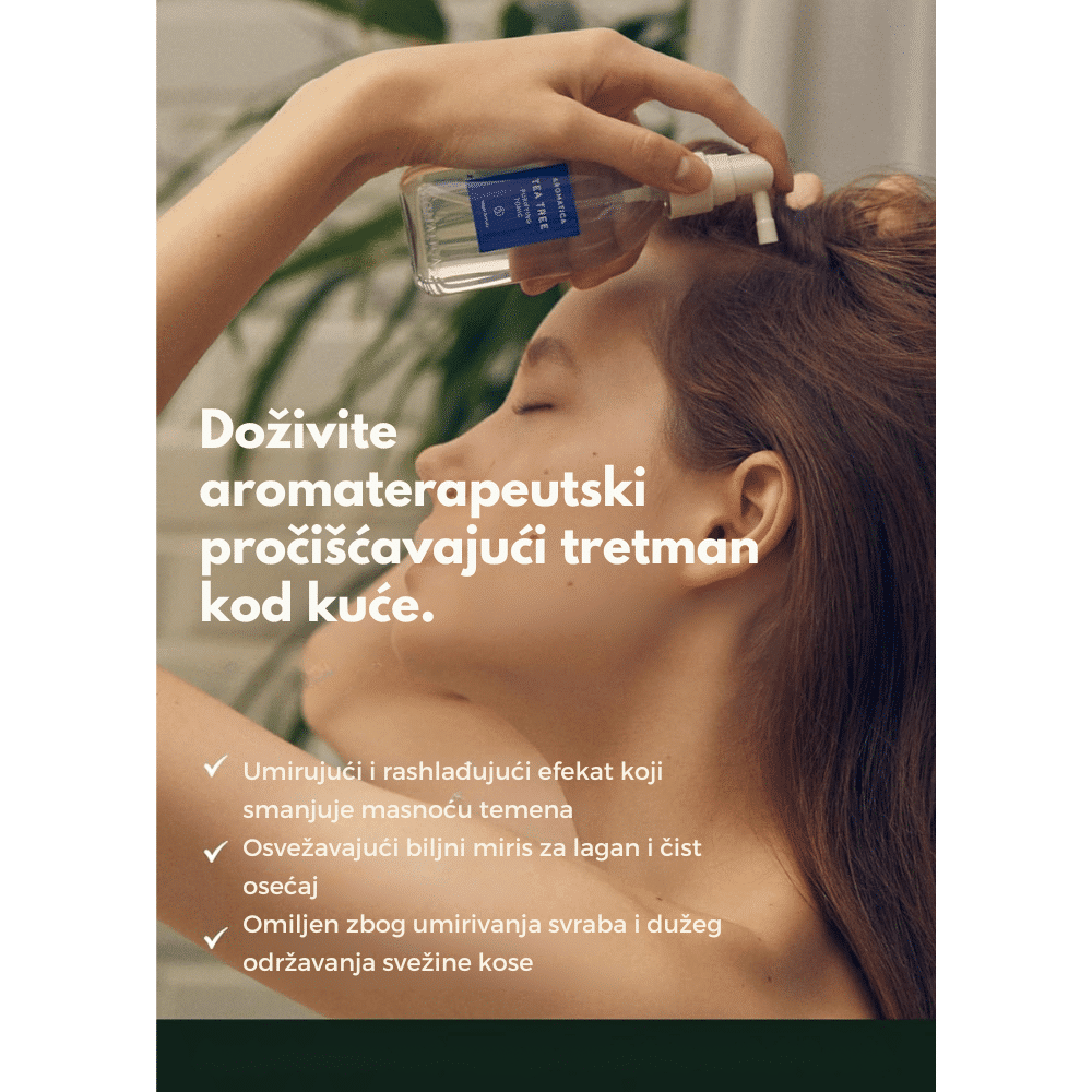 Aromatica Tea Tree Purifying Tonic je lagani biljni tonik za vlasište dizajniran da pruži trenutno osveženje, umiri iritacije i reguliše višak sebuma, čime se poboljšava celokupno zdravlje kose i vlasišta. Sa 99% prirodnih sastojaka, ovaj tonik nudi neinvazivnu i nežnu negu koja pomaže kod masnog vlasišta, svraba i nelagodnosti izazvane prekomernim lučenjem sebuma.