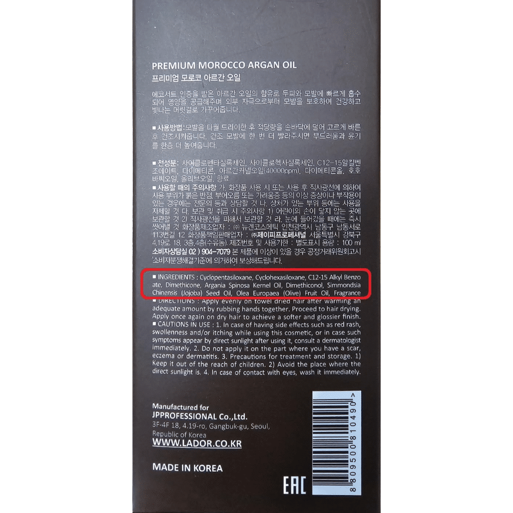 Cyclopentasiloxane, Cyclohexasiloxane, C12-15 Alkyl Benzoate, Dimethicone, Argania Spinosa Kernel Oil, Dimethiconol, Simmondsia Chinensis (Jojoba) Seed Oil, Olea Europaea (Olive) Fruit Oil, Fragrance.