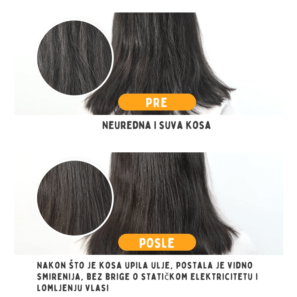 Arganovo ulje – Zlato za kosu bogato esencijalnim masnim kiselinama, vitaminom E i antioksidansima! Intenzivno hrani, hidrira i jača kosu, smanjuje lomljenje i ispucale krajeve, dok istovremeno pruža zaštitu od toplote i spoljašnjih oštećenja. Ostavlja kosu mekom, sjajnom i svilenkastom, bez osećaja težine.