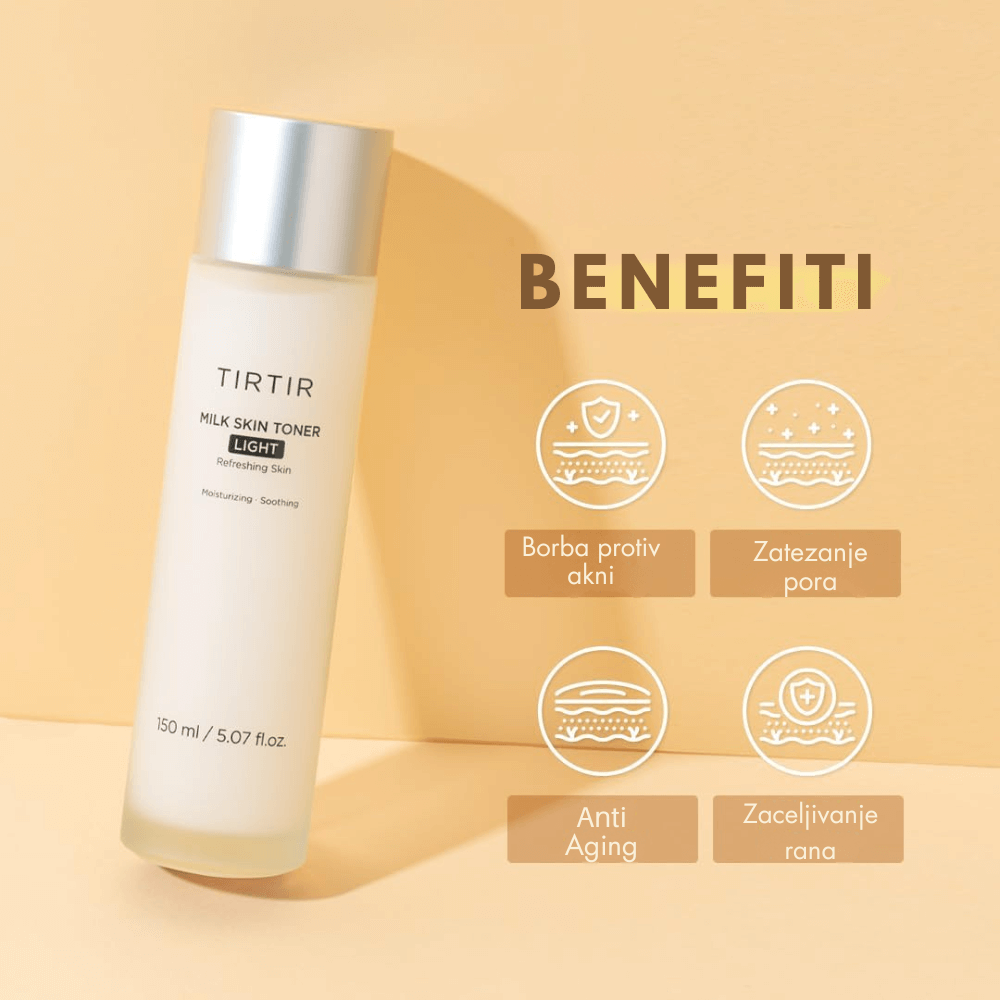 TIRTIR Milk Skin Toner Light 20ml je lagani, veganski tonik sa mlečnom teksturom, formulisan da pruži intenzivnu hidrataciju, umiri kožu i poboljša njen tonus. Obogaćen sa 4% niacinamida, ekstraktom mekinja pirinča i ceramidima, ovaj tonik pomaže u smanjenju vidljivosti pora, balansira proizvodnju sebuma i osvetljava ten. Njegova brzo upijajuća formula ostavlja kožu osveženom i bez lepljivog osećaja, čineći ga idealnim za svakodnevnu upotrebu, posebno kod masne, osetljive i aknama sklone kože. Pored toga, patentirani kompleks MultiEx BSAM Plus, koji sadrži sedam biljnih ekstrakata, dodatno umiruje i revitalizuje kožu, pružajući joj zdrav i blistav izgled.