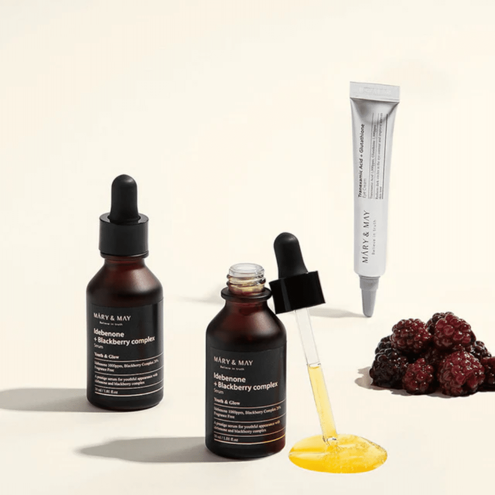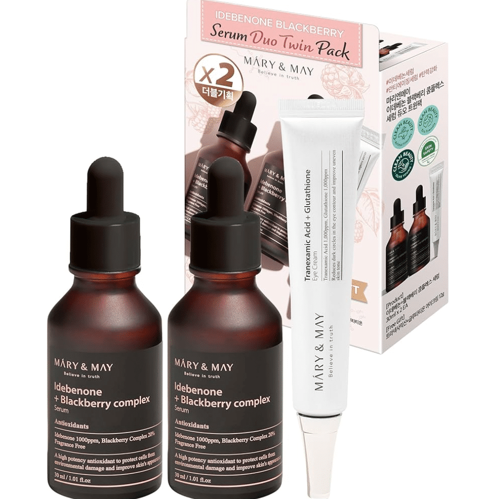 Mary&May Idebenone + Blackberry Serum Duo Twin Pack je set koji kombinuje dve visokoefikasne serume i jednu mini kremu za područje oko očiju, savršen za borbu protiv znakova starenja, tamnih krugova i poboljšanje elastičnosti kože. Set sadrži: