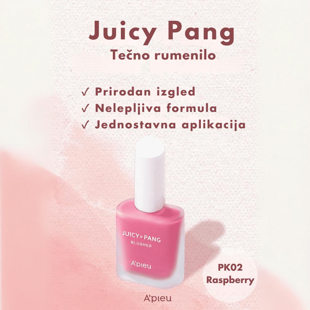 Formulisan sa hidratantnim uljima poput ulja ruže i ulja avokada, Juicy-Pang Water Blusher ne isušuje kožu i pruža joj dodatnu hidrataciju, čineći obraze svežim i blistavim. PK02 Raspberry je idealna za postizanje svežeg izgleda koji je savršen za svaki dan. Zahvaljujući praktičnom aplikatoru, nanošenje je brzo i jednostavno, a formula omogućava lako blendanje i postojanost tokom celog dana. Bilo da želite suptilno rumenilo za prirodan makeup ili intenzivniju boju, A’PIEU Juicy-Pang Water Blusher je savršeno rešenje za postizanje prozirnog, dewy finiša.