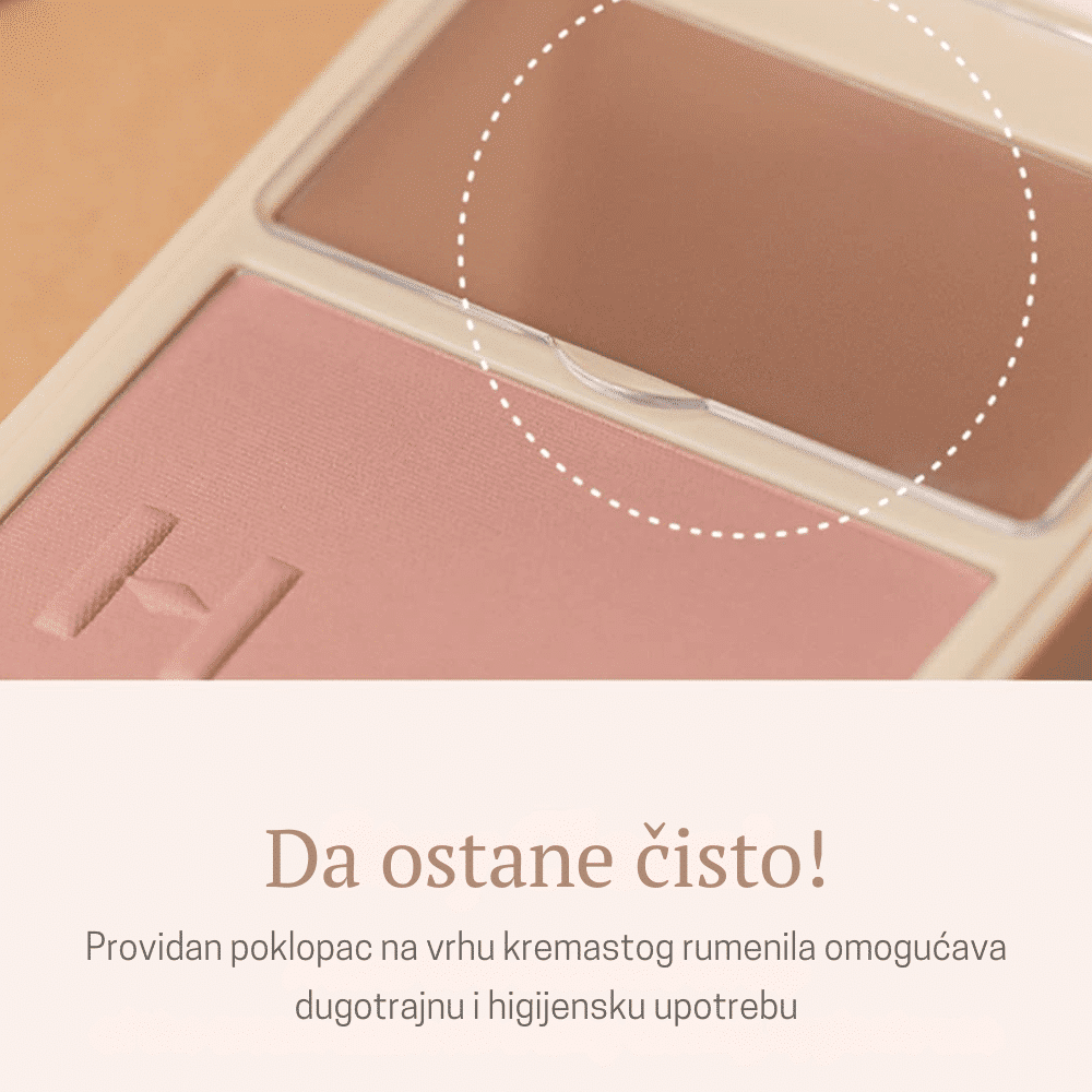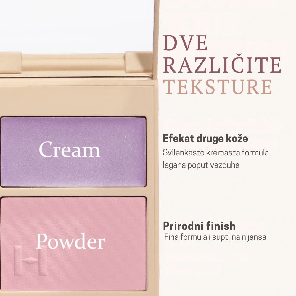 Kremasto rumenilo ima laganu, hidratantnu teksturu koja se lako nanosi i besprekorno stapa sa kožom, dok puderasto rumenilo dodaje dugotrajnost i blago baršunasti završetak. Formulacija je obogaćena hidratantnim sastojcima koji sprečavaju isušivanje i održavaju obraze mekim i negovanim.