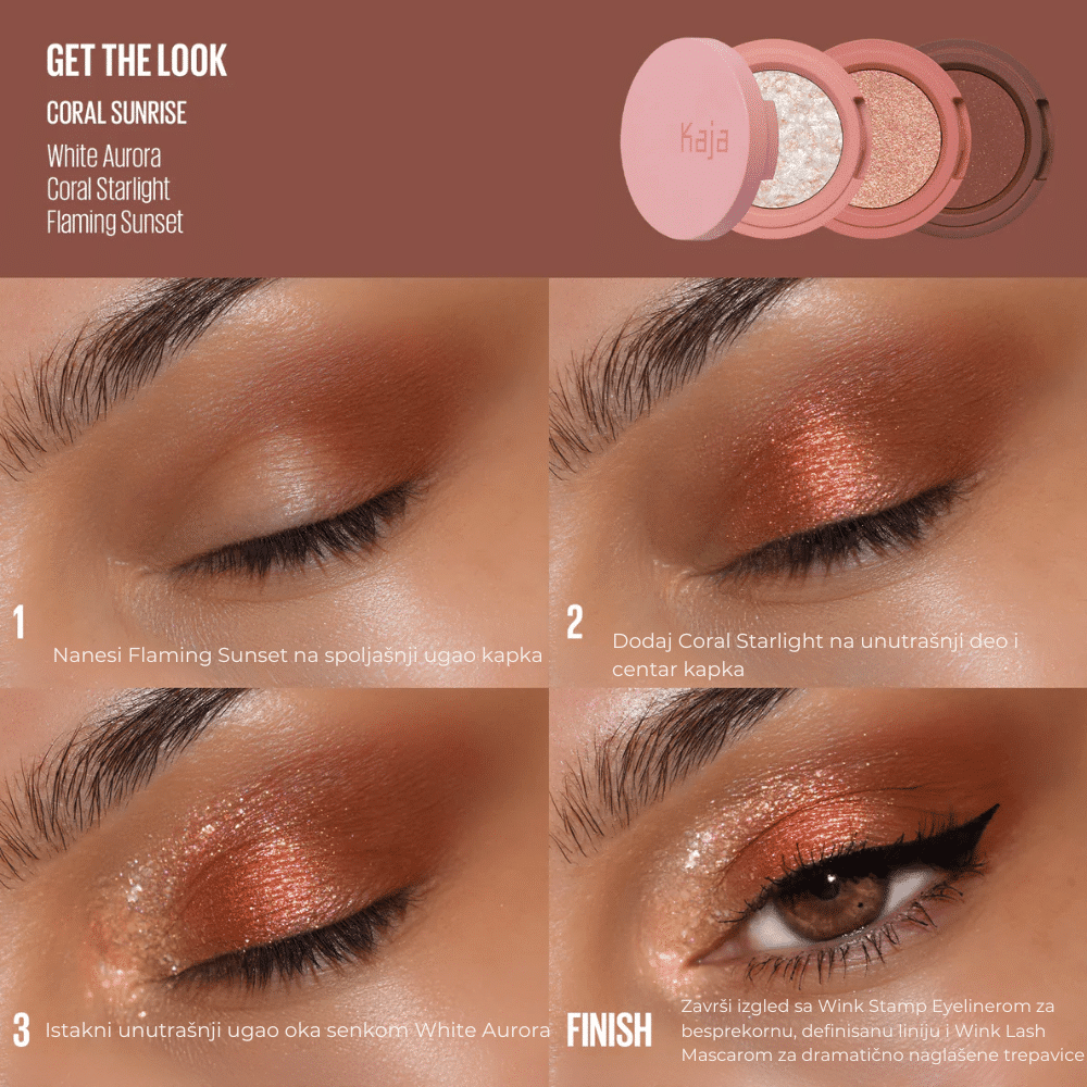 Paleta senki Coral Sunrise sa mat i svetlucavim koralnim nijansama pruža lako blendanje i dugotrajnu postojanost za svaki dan.