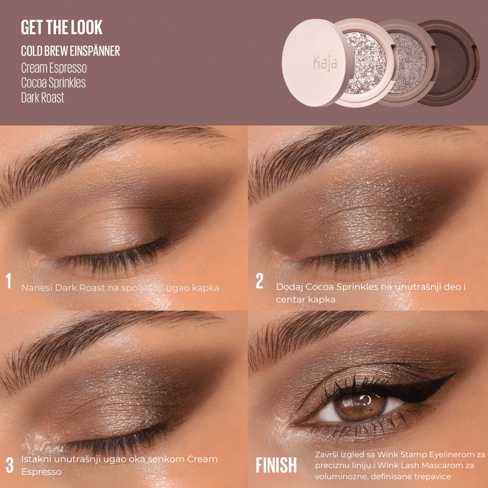 Za postizanje željenog izgleda, nanesite svetliju nijansu preko celog kapka kao bazu. Koristite tamniju nijansu za definisanje pregiba i spoljnog ugla oka, dodajući dubinu pogledu. Za dodatni sjaj, nanesite svetlucavu nijansu na centar kapka ili unutrašnji ugao oka. Senke se mogu nanositi prstima ili četkicom, u zavisnosti od željenog intenziteta boje.