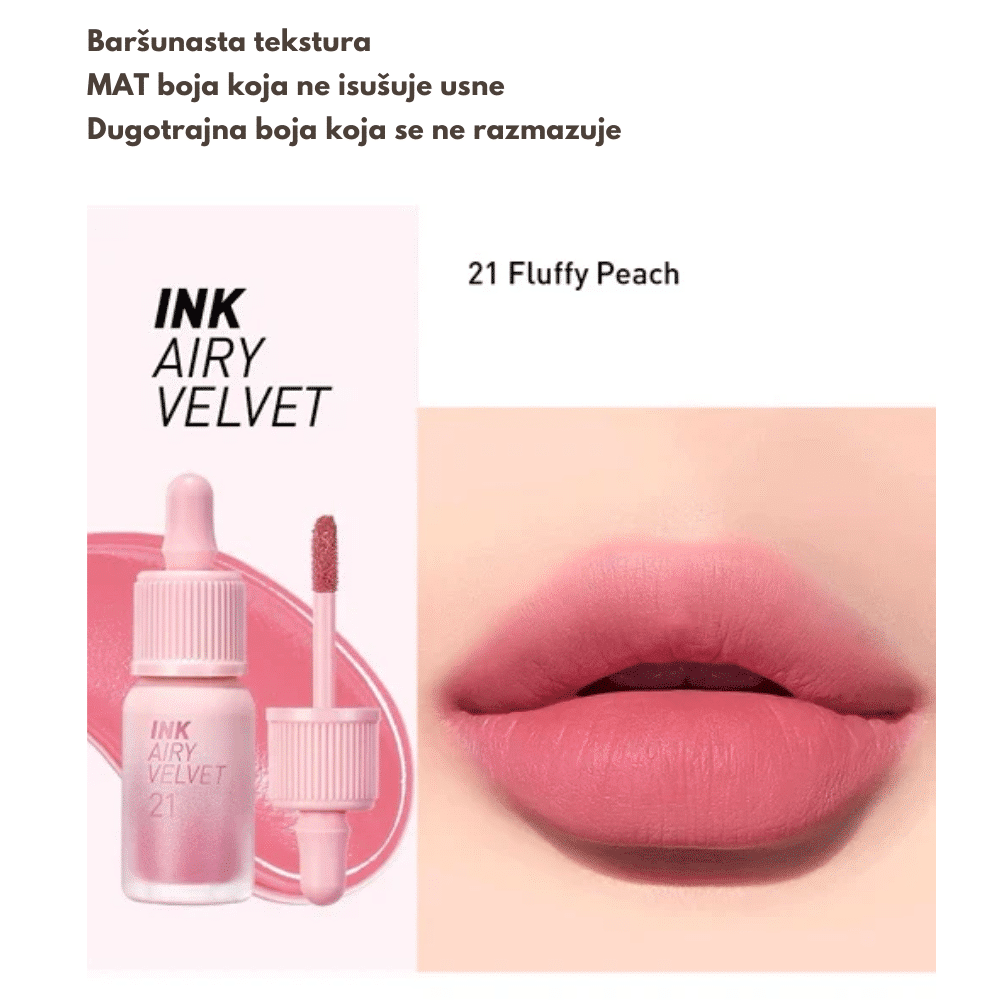 Peripera Ink Airy Velvet je kolekcija tečnih ruževa koja kombinuje intenzivnu boju i lagan osećaj na usnama, pružajući baršunasti mat finiš uz savršenu hidrataciju. Zahvaljujući inovativnoj formuli, ovi ruževi se lako nanose, ostavljaju usne glatkima i negovanima tokom celog dana, bez osećaja težine ili lepljivosti. Visoko pigmentovane nijanse pružaju živopisnu boju u samo jednom potezu, dok lagana tekstura omogućava udobnost i postojanost, čak i nakon obroka. Ruževi su obogaćeni hidratantnim sastojcima poput hijaluronske kiseline i voćnih ekstrakata, koji sprečavaju suvoću usana i čine ih mekim i hidriranim.