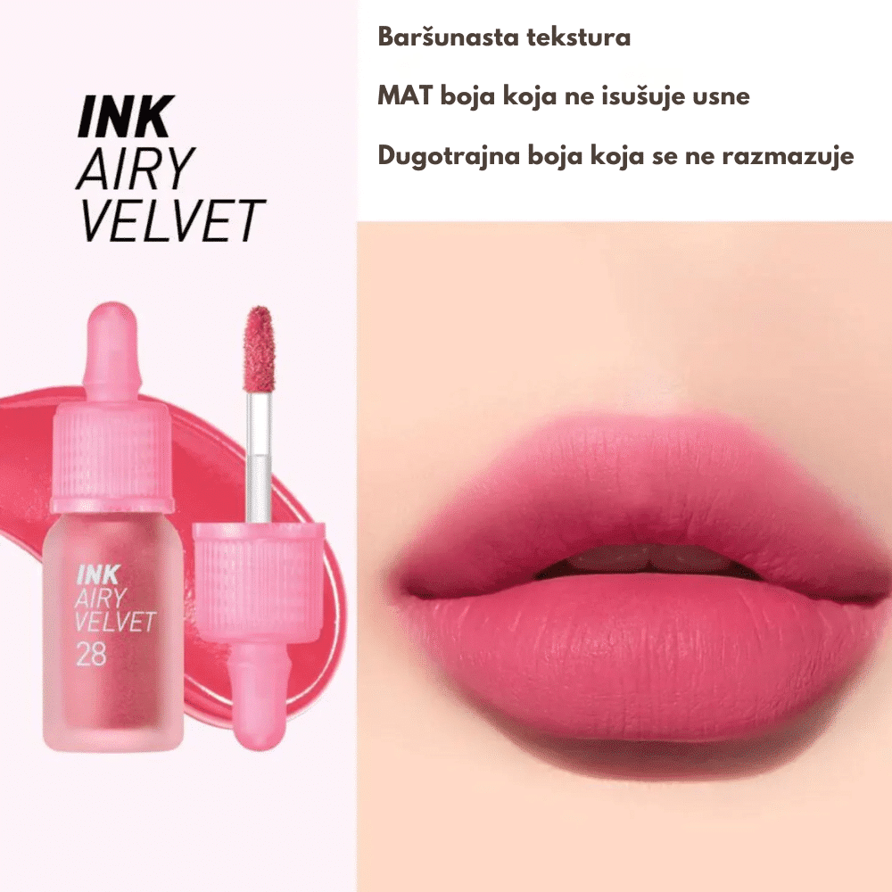 Peripera Ink Airy Velvet je kolekcija tečnih ruževa koja kombinuje intenzivnu boju i lagan osećaj na usnama, pružajući baršunasti mat finiš uz savršenu hidrataciju. Zahvaljujući inovativnoj formuli, ovi ruževi se lako nanose, ostavljaju usne glatkima i negovanima tokom celog dana, bez osećaja težine ili lepljivosti. Visoko pigmentovane nijanse pružaju živopisnu boju u samo jednom potezu, dok lagana tekstura omogućava udobnost i postojanost, čak i nakon obroka. Ruževi su obogaćeni hidratantnim sastojcima poput hijaluronske kiseline i voćnih ekstrakata, koji sprečavaju suvoću usana i čine ih mekim i hidriranim.