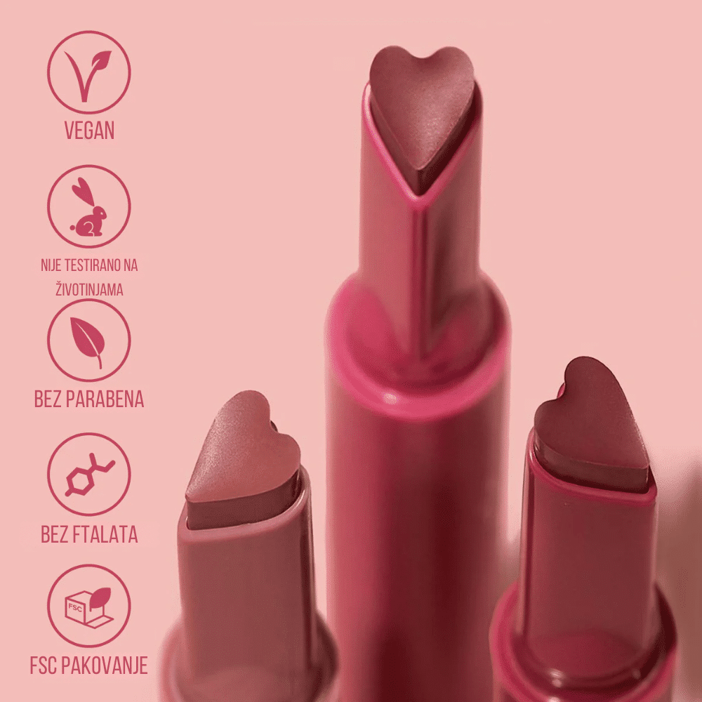 Kremasti ruž u obliku srca sa baršunastim finišom i hidratantnim sastojcima za glatke, negovane usne.